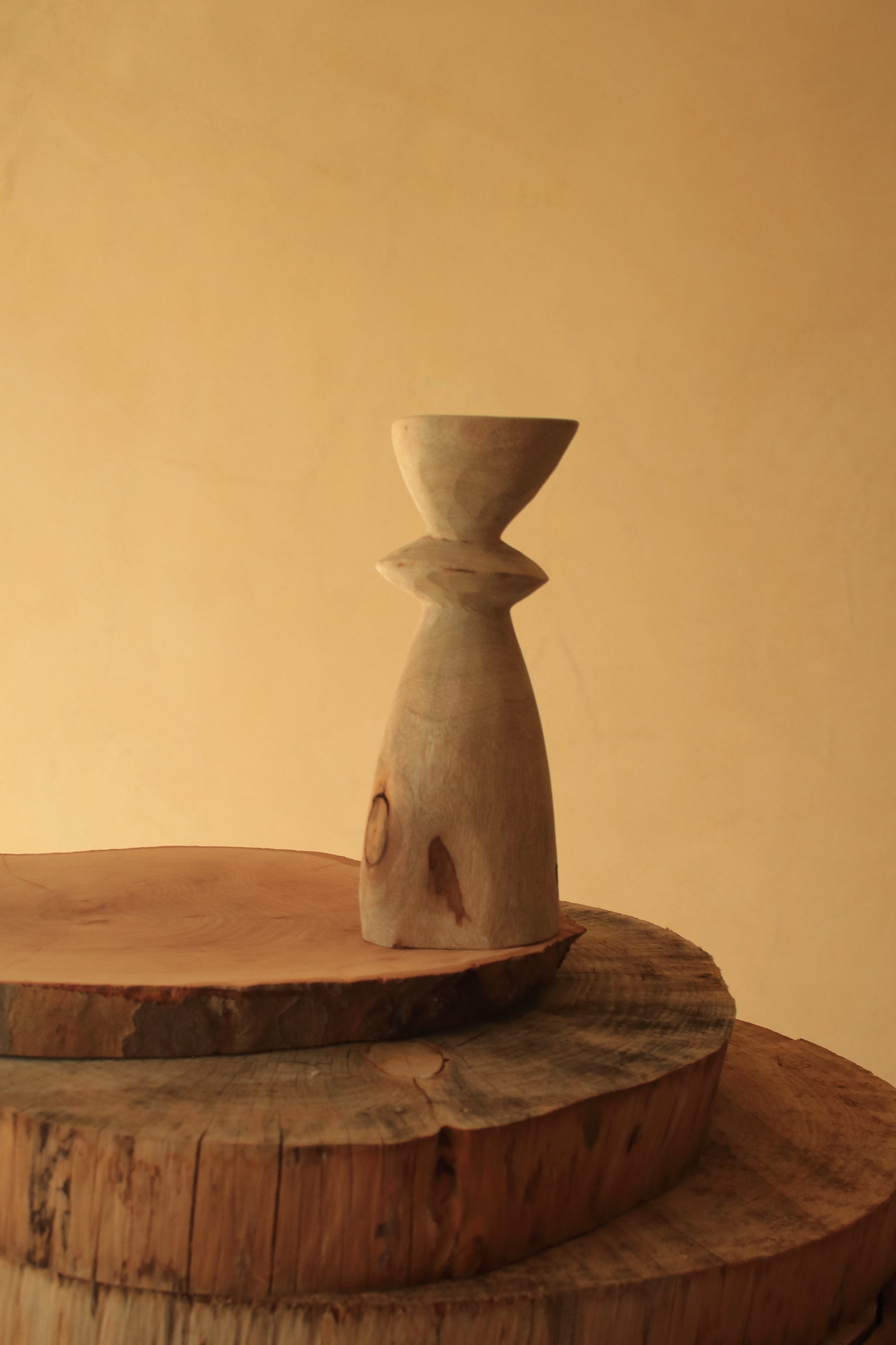 Designed to hold standard dinner candles, each piece is carefully shaped to highlight the natural grain, knots, and imperfections, making every holder one-of-a-kind. Their sculptural silhouettes create a striking display—whether standing alone or arranged as a set.